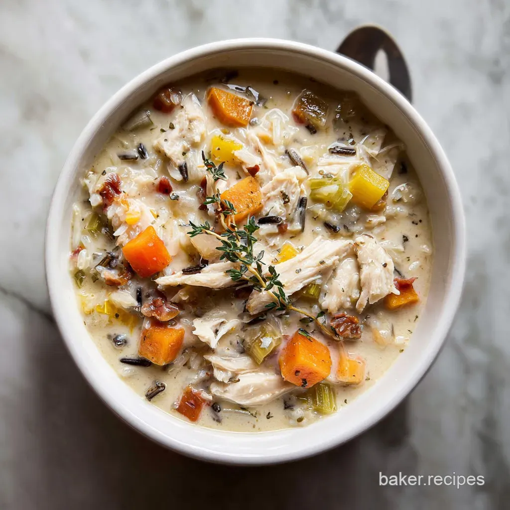 Serve the soup in wide, shallow bowls rather than deep mugs. This allows the wild rice and turkey chunks to stay visible on the surface. Add a crack of fresh black pepper and a tiny sprig of fresh thyme in the center for a professional look.